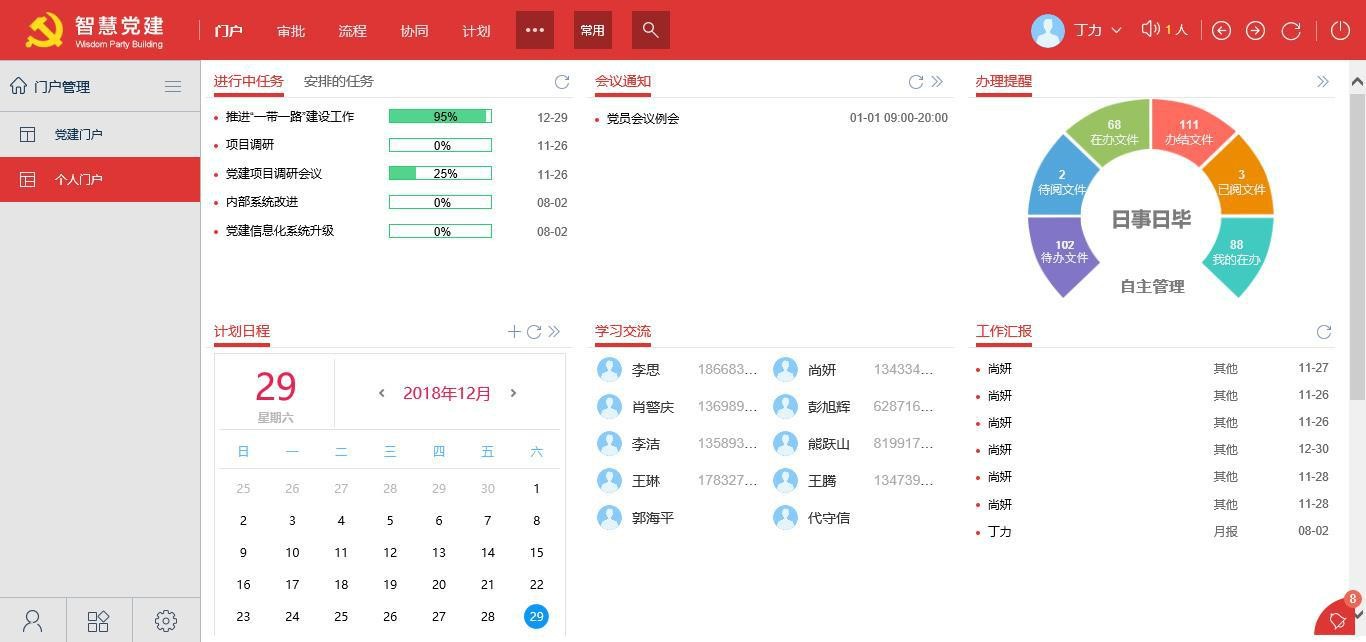 个人门户设计目标主要是方便党员干部快速了解,会议通知、领导下达的任务、任务完成进度情况;计划日程可以形象地展示每日的工作日程安排情况;