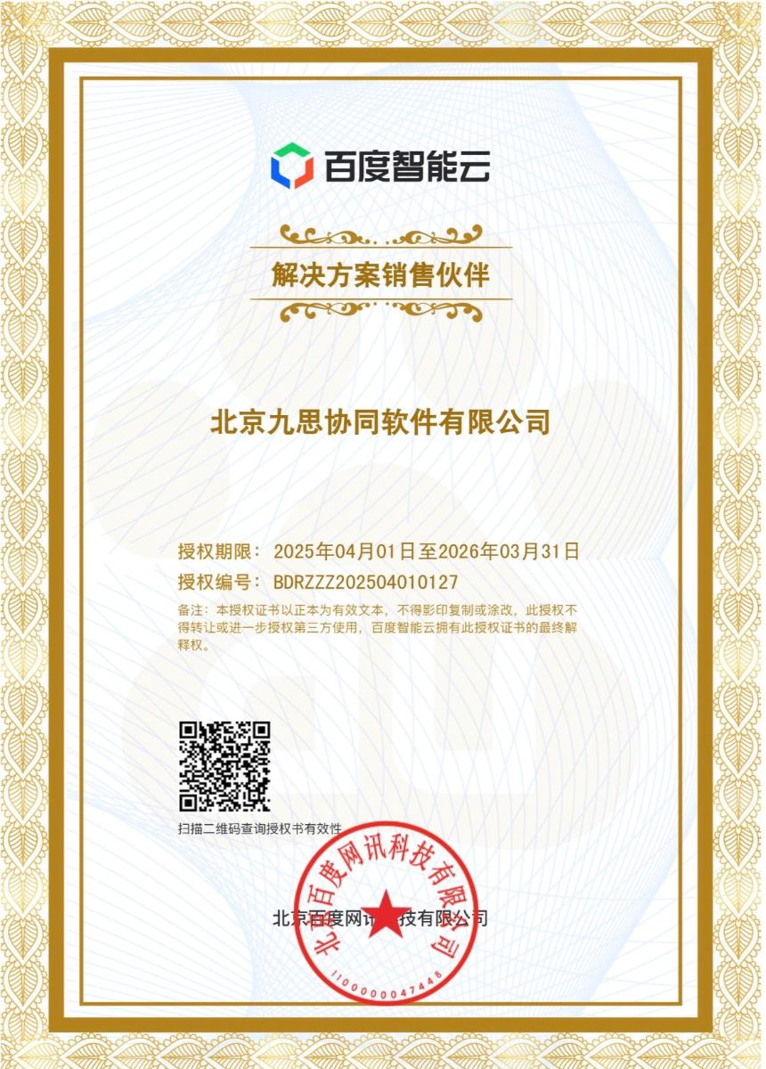 近日,九思软件与百度智能云正式达成解决方案销售伙伴关系,双方将在人工智能、大数据处理、云计算等核心技术领域深化合作,围绕产品创新与服务升级展开深度协作,打造更具竞争力的产品组合和服务体系,为客户提供高品质、高效率综合解决方案,助力客户在数字化转型中抢占先机、实现高质量发展。