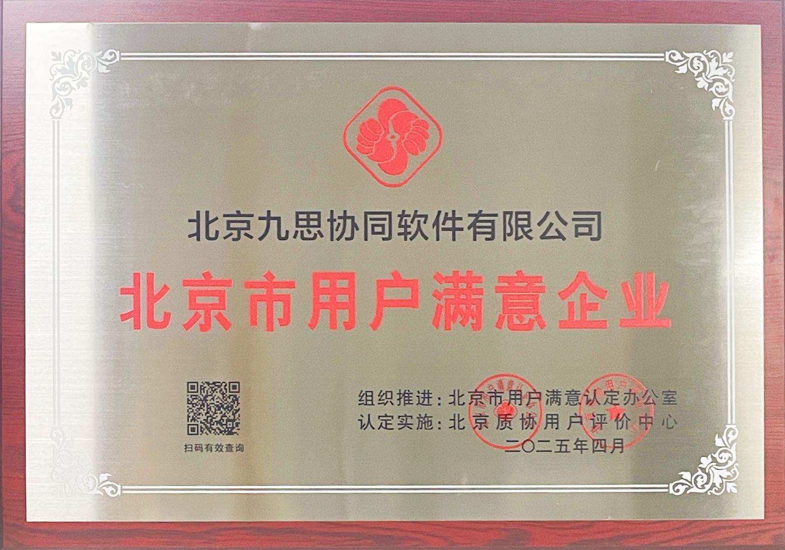 “北京市用户满意企业”评定工作由北京市用户满意认定办公室组织推进,北京质协用户评价中心严格依据《中共中央国务院关于开展质量提升行动的指导意见》及《北京市用户满意认定规范》实施。评选过程涵盖材料审核、现场考察、用户满意度调查等多个环节,经过层层筛选,九思软件凭借优质的产品质量保障、完善的客户服务资源体系、成熟的客户关系管理经验以及出色的用户满意度调研结果,成功入选最终名单,并在北京市质量服务公共平台公示。