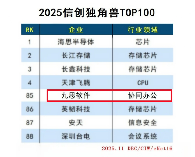 近日,由德本咨询(DBC)、中国科学院《互联网周刊》(CIW)联合推出的 “2025信创独角兽TOP100” 榜单揭晓,九思软件凭借自身在信息技术应用创新领域的核心竞争力再次入围榜单。