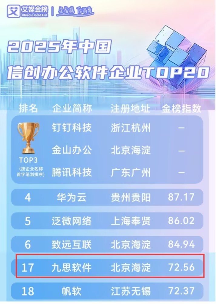 2025年8月,艾媒咨询旗下艾媒金榜发布《2025年中国信创办公软件企业TOP20》榜单,九思软件凭借扎实的综合实力、领先的产品研发能力与良好的行业口碑成功上榜,再次彰显了公司在信创办公软件领域的核心竞争力与行业认可度。