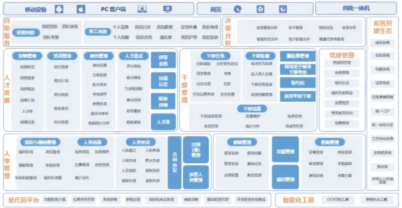 • 全场景一体化覆盖:深度融合“人事+干部+人才+党建”四大业务领域,整合33个功能场景,实现国企人力、人才、干部、党建全业务闭环管理,贯穿员工、干部、党员全生命周期。