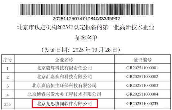近期,全国高新技术企业认定管理工作领导小组办公室发布《对北京市认定机构2025年认定报备的第一批高新技术企业进行备案的公示》。九思软件凭借扎实的研发实力、创新能力及规范的企业管理,经过严格的测评和审批程序,顺利通过三年一期的复审,再度获得国家级“高新技术企业认定”(证书编号:GR202511000235)。
