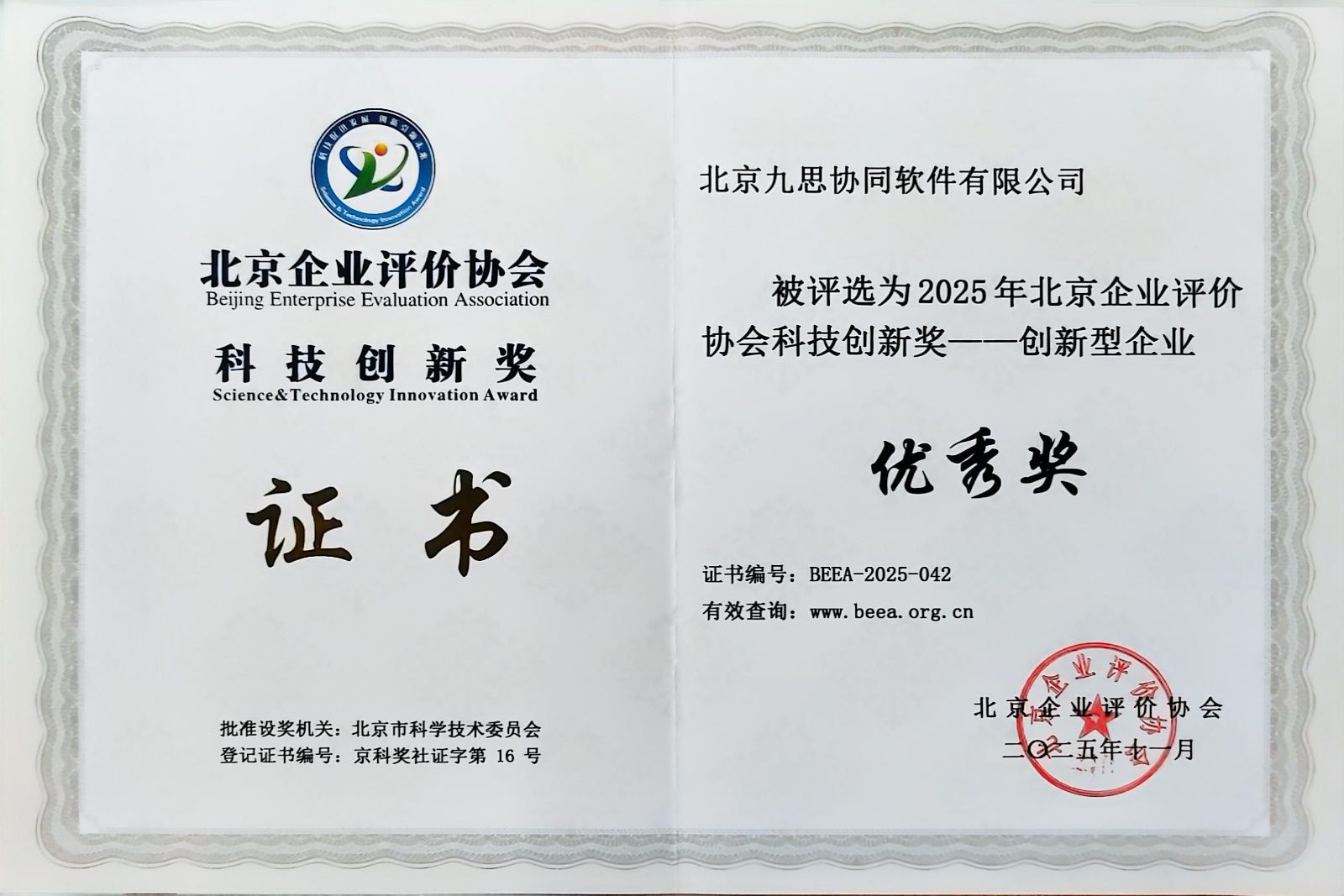 荣誉 | 九思软件荣获“2025年北京企业评价协会创新型企业优秀奖”